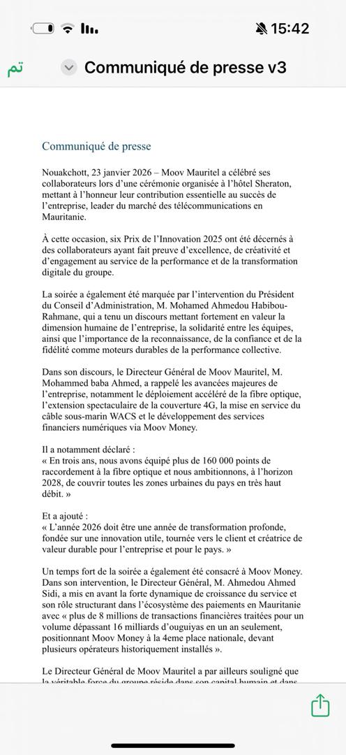 Dans son discours, le Directeur Général de Moov Mauritel, M. Mohammed baba Ahmed, a rappelé les avancées majeures de l’entreprise, notamment le déploiement accéléré de la fibre optique, l’extension spectaculaire de la couverture 4G, la mise en service du câble sous-marin WACS et le développement des services financiers numériques via Moov Money.