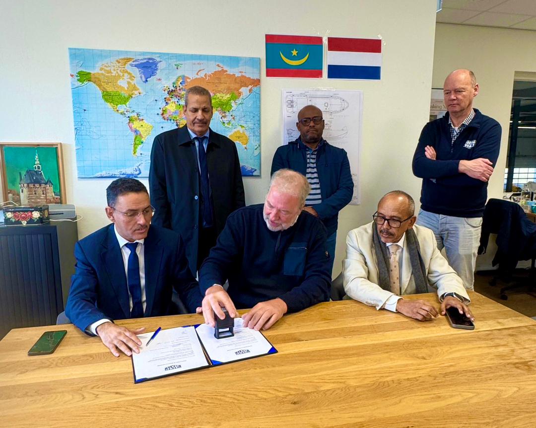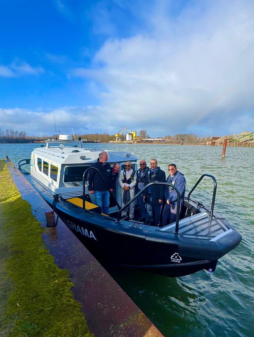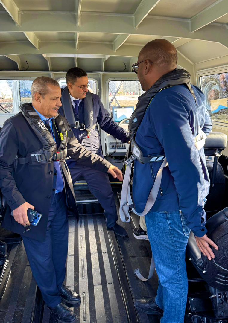 La réception provisoire du nouveau bateau pilote maritime "Maghama" a eu lieu au chantier naval de Tide Man Boats à Amsterdam, dans le cadre du renforcement et de la modernisation des moyens maritimes. La cérémonie de réception s'est déroulée sous la supervision du Directeur Général, Monsieur Lemrabott Ould Benahi, et en présence du Directeur du chantier naval, Monsieur Tide Man, ainsi que de plusieurs responsables des deux parties, dont Monsieur Ali Ould Seyid, Directeur de la Capitainerie, Monsieur Ethmane Cherif Mleinin, Directeur de la Sécurité Portuaire, et Monsieur Mohamed Ould Chein, Président du Comité de Passation des Mar