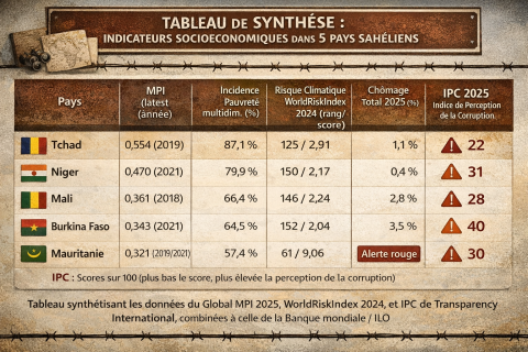 Dans plusieurs pays du Sahel, l’incidence de pauvreté multidimensionnelle touche plus des deux tiers de la population — atteignant près de 80 % au Niger et plus de 85 % au Tchad —, tandis que des millions d’actifs évoluent dans une économie informelle quasi généralisée. Les taux de chômage « ouverts », (globalement inférieur 10%), masquent en réalité un sous-emploi massif et des trajectoires de survie économique. À cela s’ajoute une forte vulnérabilité climatique (avec des indices pouvant atteindre 9,06), qui alimente tensions sur les ressources, conflits locaux et déplacements.