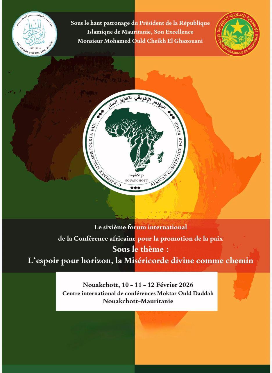 Sous le haut patronage de Son Excellence Monsieur Mohamed Ould Cheikh El Ghazouani, Président de la République Islamique de Mauritanie, la capitale Nouakchott accueillera le sixième Forum international de la Conférence africaine pour la promotion de la paix, du 10 au 12 février 2026 au Centre International des conférences- Mokhtar Ould Daddah (ancien Palais des Congrès)